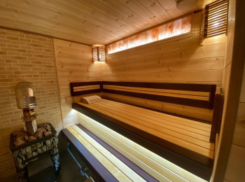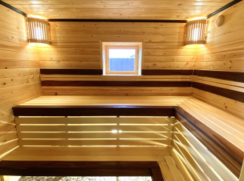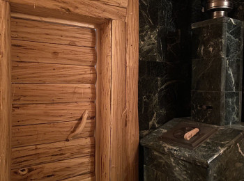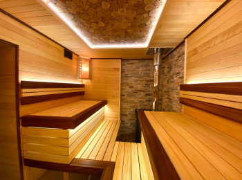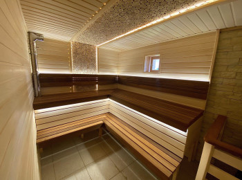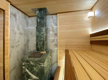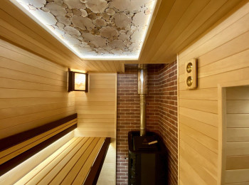 Монтаж вентиляции. Панно из Сибирского можжевельника с сопровождением светодиодной ленты. Подспинники и полки с сопровождением светодиодной ленты. Декоративные светильники. Укладка плитки во всех комнатах по полу и стенам. В помывочной, топочной, санузле потолки из материала Лиственница.