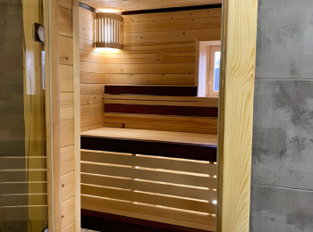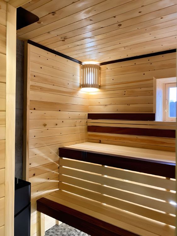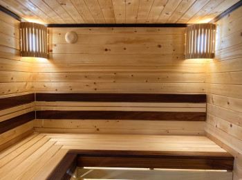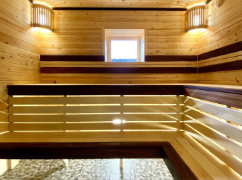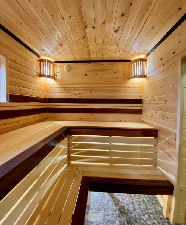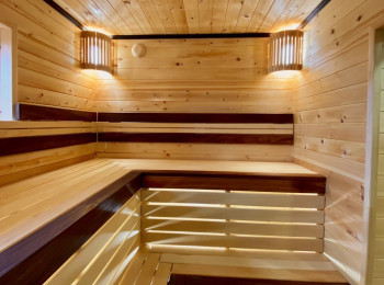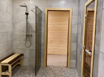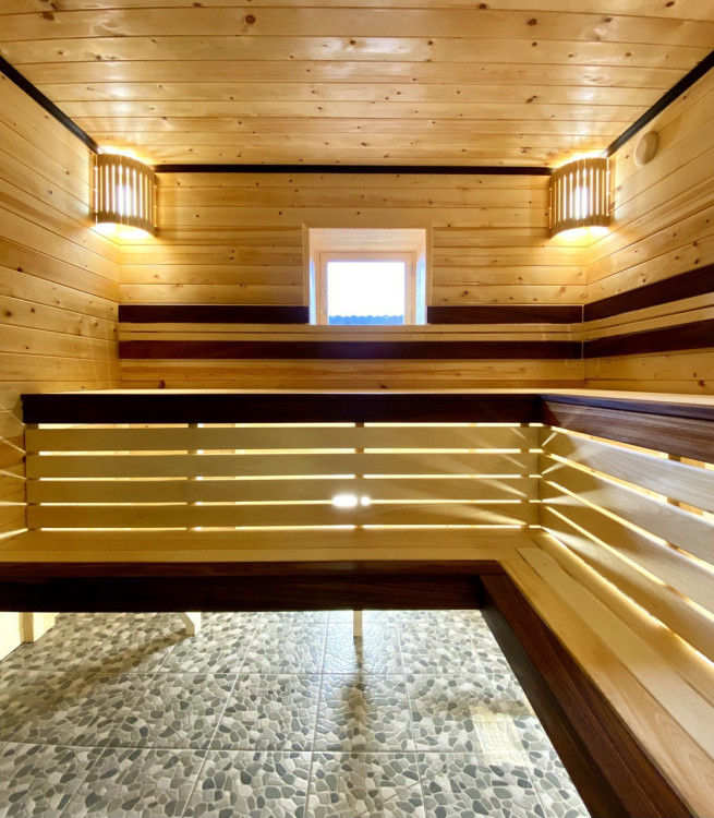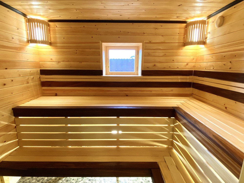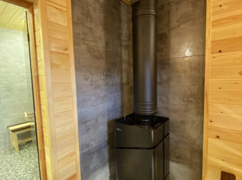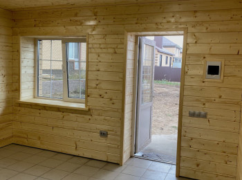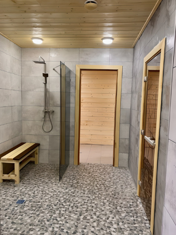 Монтаж вентиляции. Укладка плитки во всех комнатах по полу и стенам. Выполнена отделка в помывочной, топочной и комнате отдыха из материала имитация бруса Хвоя сорт АБ.