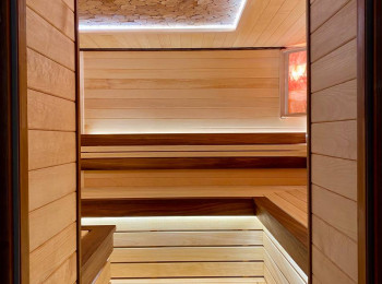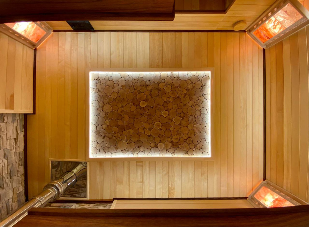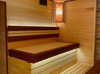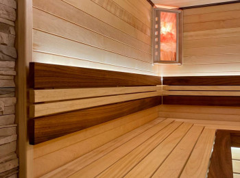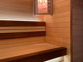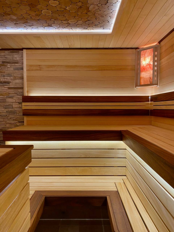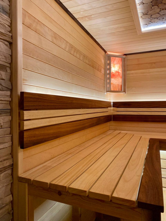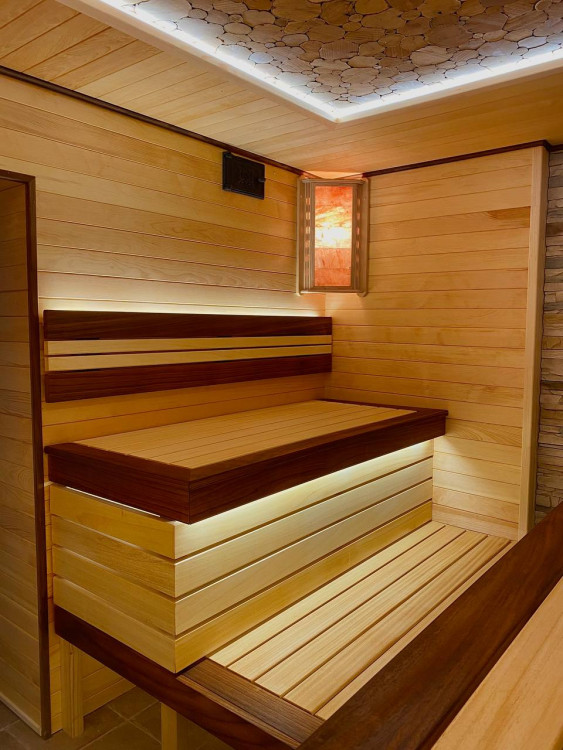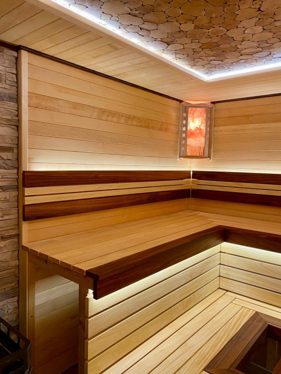 Монтаж вентиляции. Панно из Сибирского можжевельника с сопровождением светодиодной ленты. Полок и подспинник с сопровождением светодиодной ленты. Абажуры с гималайской солью.