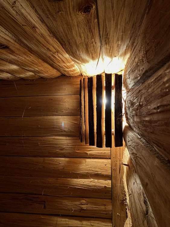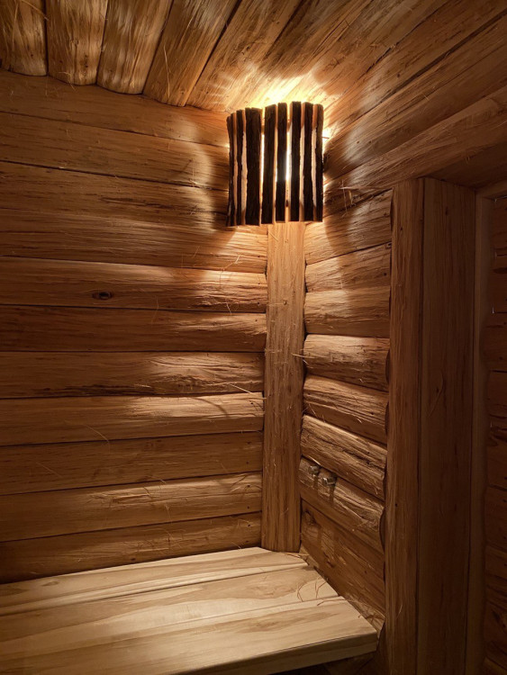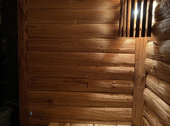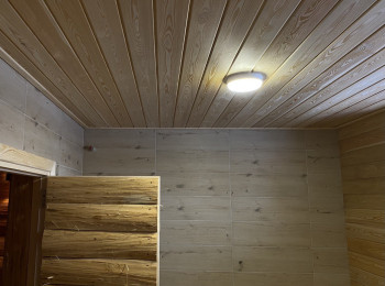 Монтаж вентиляции. Парящие полки. Абажуры выполнены из обрезной доски с корой Липы. Также были проведены работы в помывочной и комнате отдыха: внутренняя отделка стен и потолков из кедра.