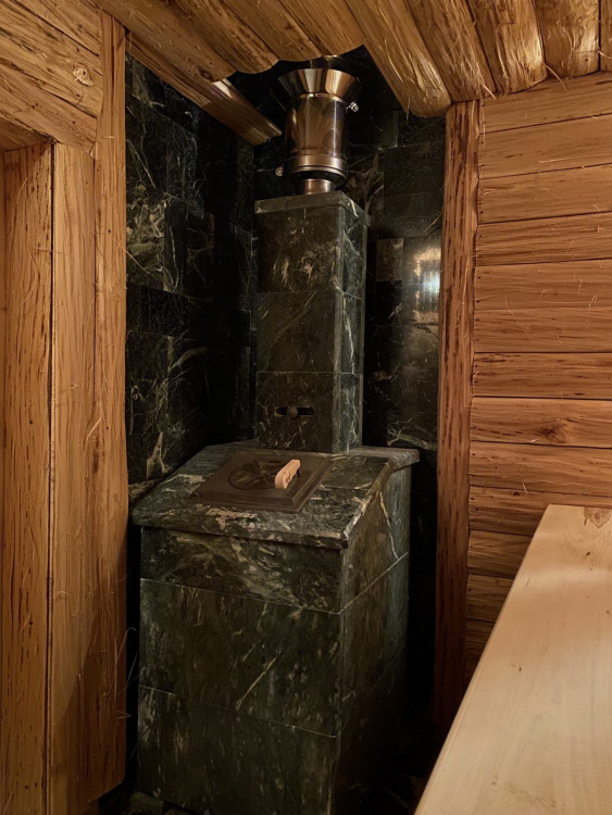 - Стена у печи: Камень Змеевик